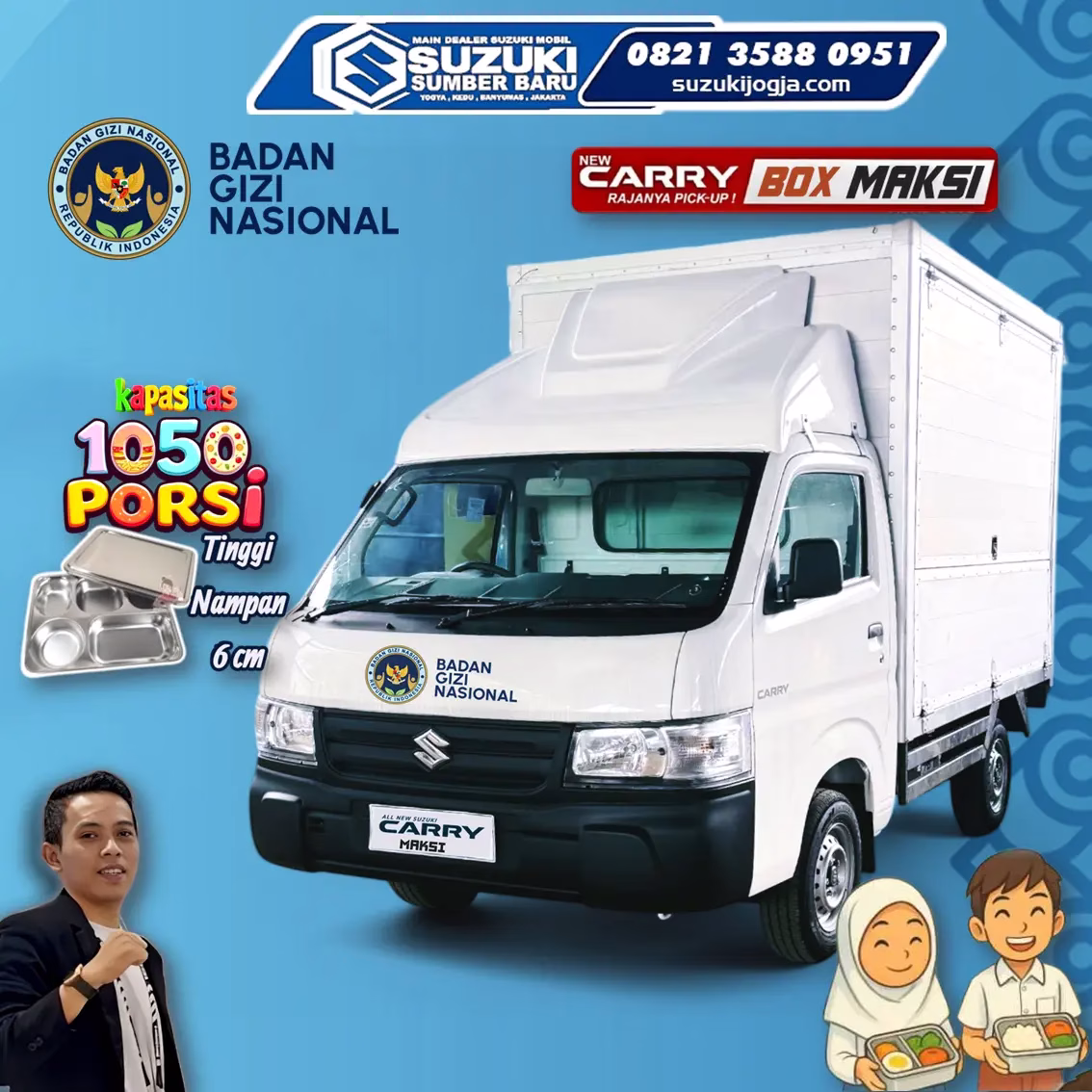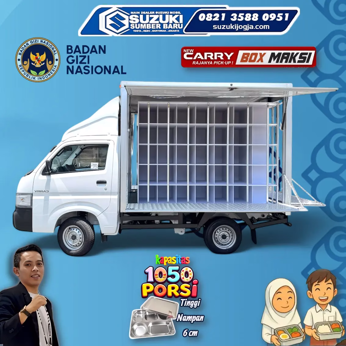Suzuki New Carry Box bukan sekadar kendaraan, melainkan solusi nyata yang mendukung suksesnya program kemanusiaan. Bersama Suzuki Jogja, mari kita wujudkan distribusi makanan bergizi gratis yang lebih efektif dan efisien dengan kapasitas muat besar sampai dengan 1050 porsi dengan ukuran tinggi nampan 6cm sesuai aturan BGN, demi masa depan bangsa yang lebih sehat.